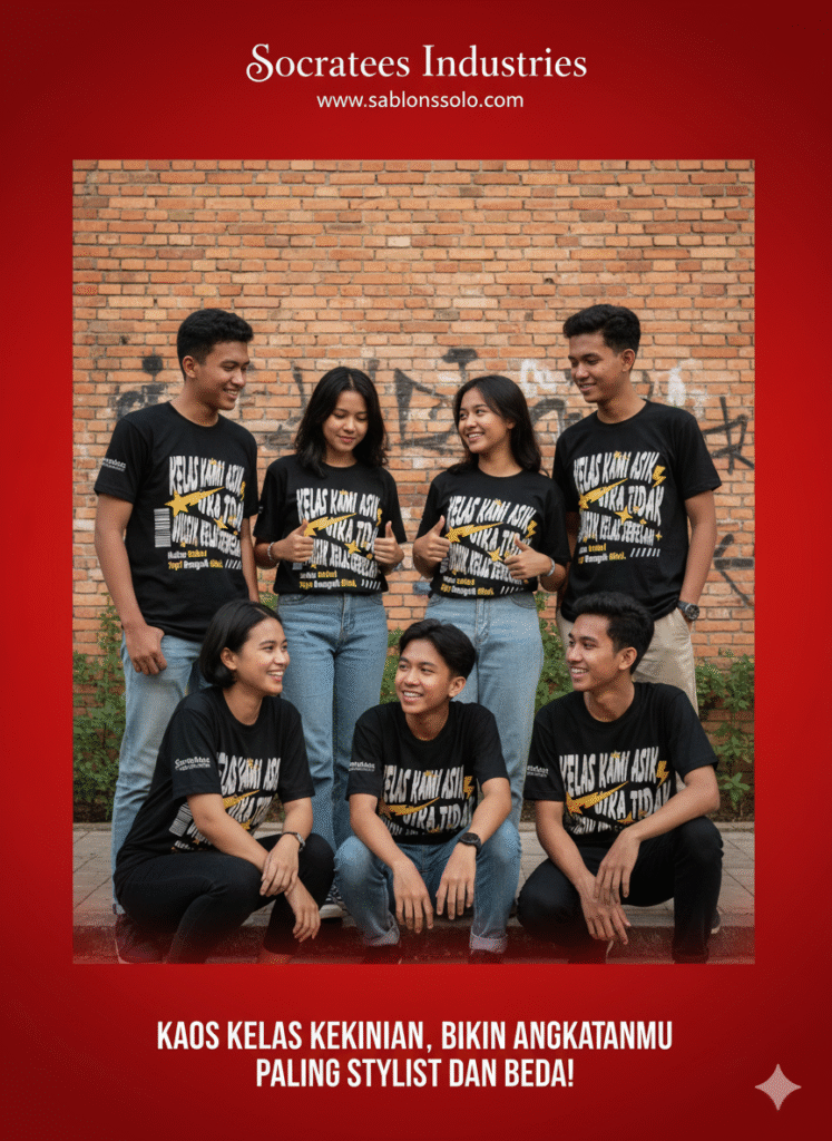 Jangan batasi kreativitas kalian hanya karena keterbatasan teknik sablon lama. Pilih Kaos Kelas Digital Printing dari SablonSolo.com dan tunjukkan desain paling keren, full color, dan paling detail yang pernah ada!